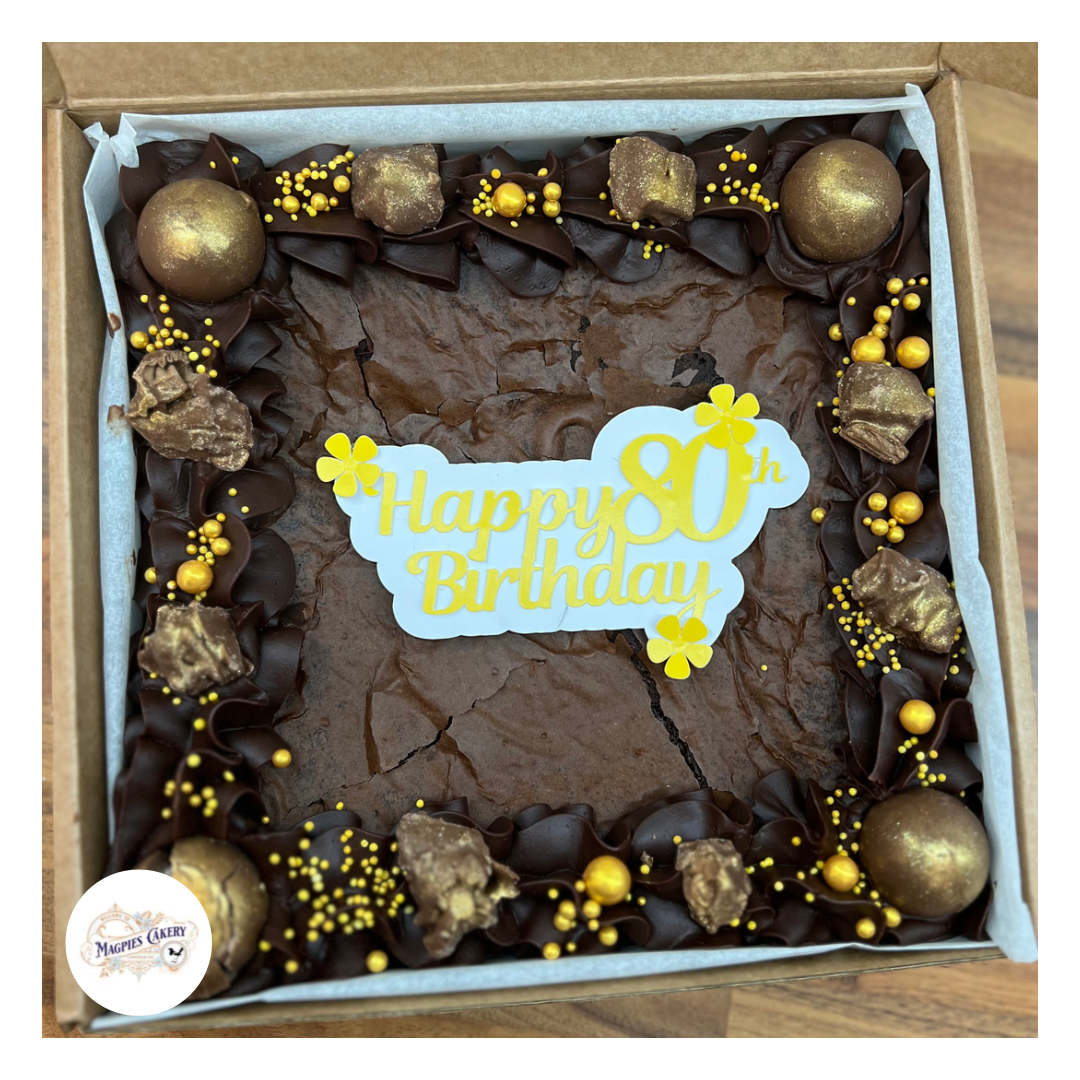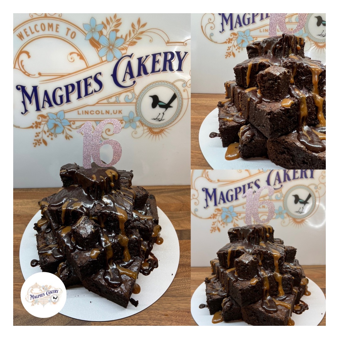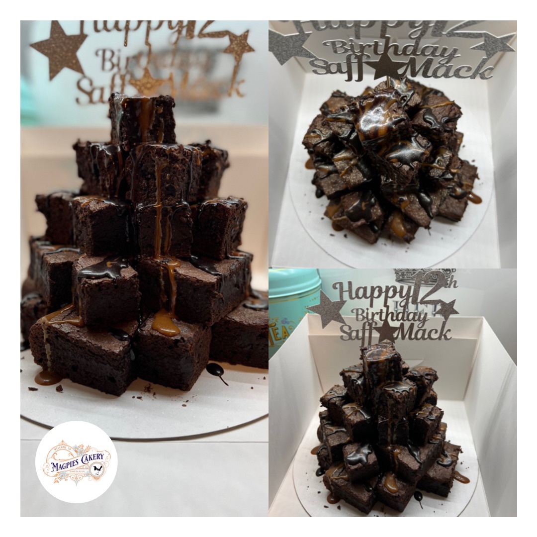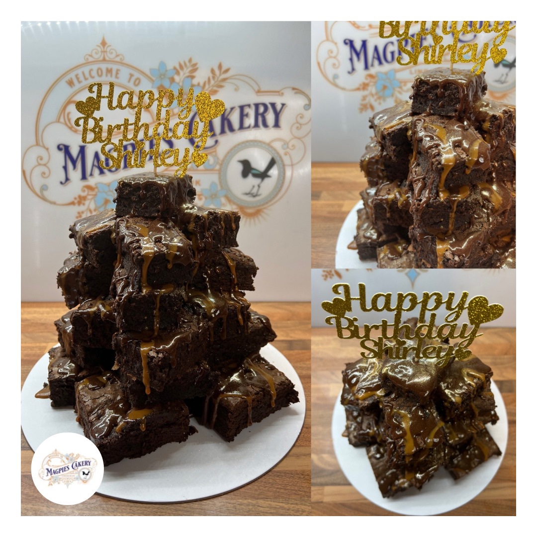 Brownie stacks are a great alternative to a cake! Gorgeous gooey brownies, stacked and drizzled with caramel and chocolate, complete with personalised topper. Brownie slabs are personalised for you, 7″ squares of brownie, perfect for sharing or keeping all to yourself! Brownie slabs can be posted first class in the UK